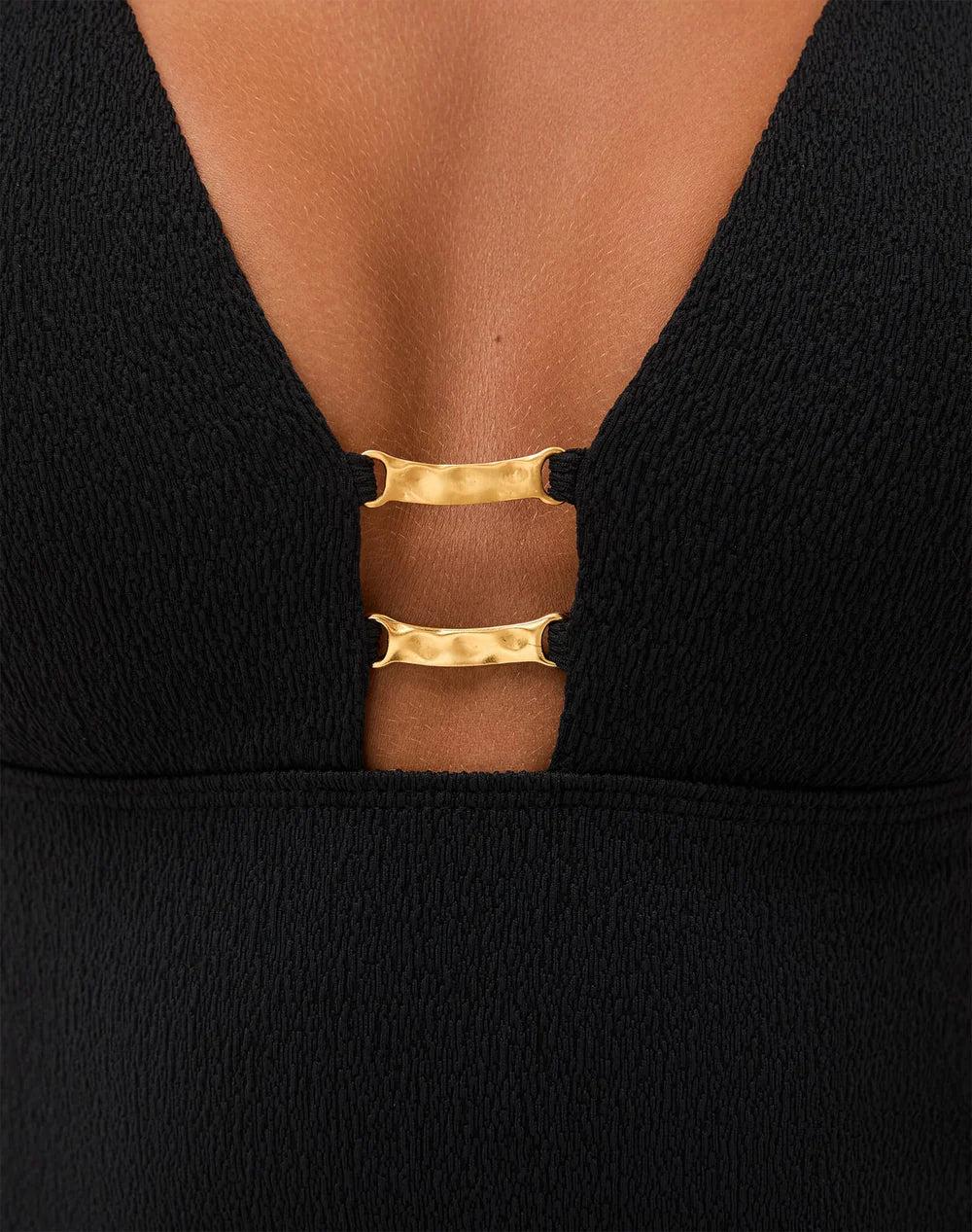 The ViX Firenze Elisa Short Dress is a mini bodycon silhouette with a v-neckline adorned with gold-plated details at the bust, wide shoulder straps, and an open back.