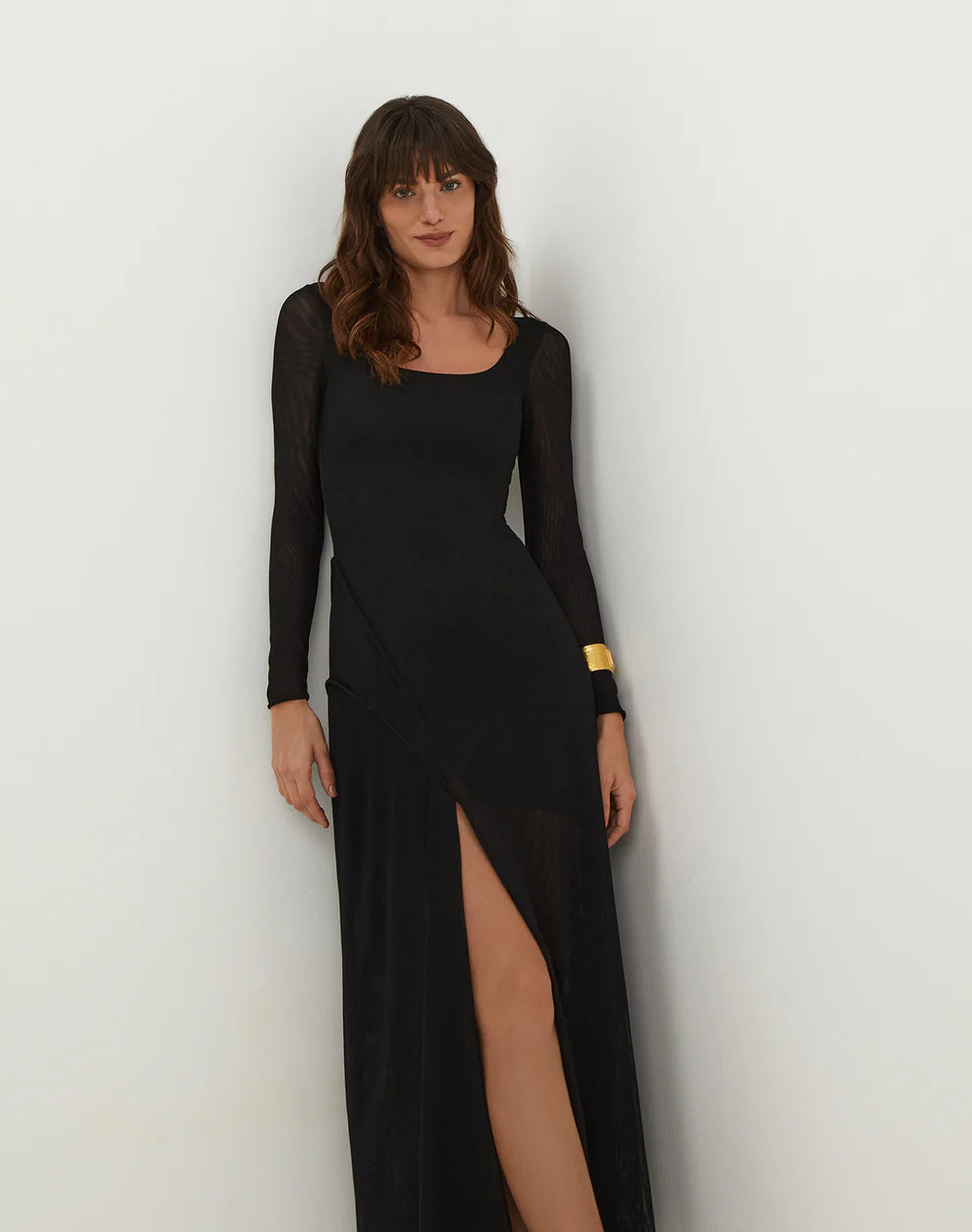 The ViX Lavinia Long Dress is a relaxed maxi silhouette featuring a scoop neckline, long sleeves, and gathered fabric at the side for an elegant draped effect. A front slit and natural ruching throughout add movement and texture. Crafted from our wrinkle-resistant fabric for effortless wear. Style the Lavinia Long Dress with flat sandals and ViX accessories for a resort-ready look.